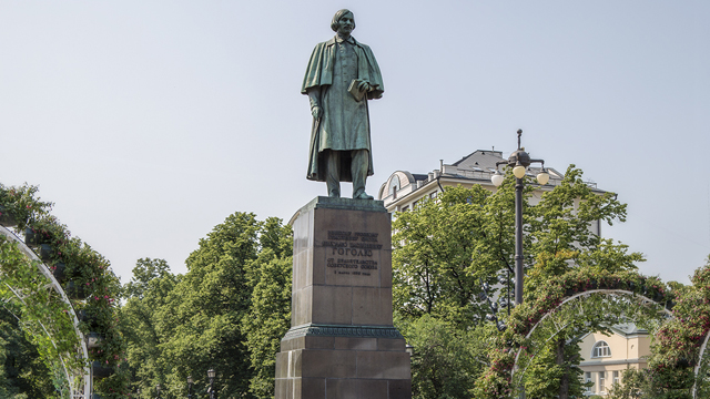 Вот мы с вами можем увидеть: эта часть бульвара называется Гоголевский бульвар, потому что здесь стоит памятник великому русскому писателю Николаю Васильевичу Гоголю. Москва — город литературный, и здесь много памятников писателям и поэтам.