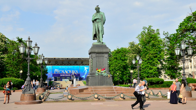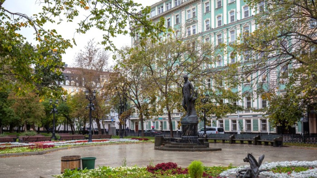 Здесь начинается Пушкинский бульвар. Вы сами догадались, почему. Это памятник Александру Сергеевичу Пушкину, ещё один символ Москвы. Он был открыт в 1881 году, и это было большое культурное событие. На открытии памятника великолепную речь сказал Фёдор Михайлович Достоевский о значении Пушкина для русской культуры и для культуры всего мира. А для обычных москвичей это просто место встреч. Люди договариваются встретиться здесь и вместе пойти погулять, в театр или в ресторан.