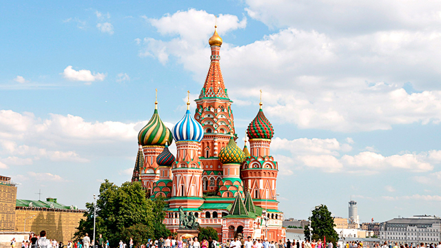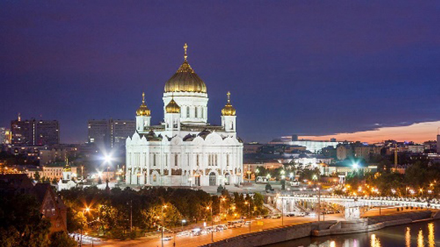 На другой стороне Москвы-реки мы можем увидеть замечательный храм. Это храм Христа Спасителя — главная церковь, главный собор города Москвы. У этого собора очень интересная, трагическая история. Его построили в 19 веке. Но это здание, которое вы сейчас видите, новое. Почему? Дело в том, что в 19 веке это здание строили долго, с любовью, почти 45 лет. Собор начал действовать в 1883 году. И он был самым высоким зданием Москвы, самой высокой церковью Москвы. К сожалению, после революции, когда наша страна называлась Советский Союз, правительство приняло решение разрушить этот храм. Была пропаганда атеизма, говорили, что Бога нет, церкви не нужны, поэтому в 1931 году прекрасный собор Христа Спасителя взорвали. Его не стало. На этом месте хотели построить большой Дворец Советов с огромной статуей Ленина. Эта статуя должна была быть высотой 100 метров, и на ладони памятника Ленину мог поместиться большой автомобиль. Но началась война, эти планы не реализовали, а после войны на этом месте открыли бассейн. Это был популярный городской бассейн «Москва», который существовал очень долго. Но после тогокак в нашей стране произошли большие изменения и она опять стала называться Россией, новое правительство приняло решение вернуть... построить старый храм. Его уже строили не 45 лет, а очень быстро — 3 года. И вот это здание, которое вы видите, это новое здание, которое было построено в конце 90-х годов. Там проходят большие церковные праздники.