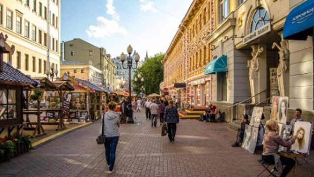 Мы с вами пришли на одно из самых интересных мест Москвы. Это пешеходная улица Арбат. Пешеходная — здесь нет машин. Здесь люди просто гуляют. Это место очень известное. Сейчас утро, поэтому здесь не так оживленно. Через несколько часов сюда придут художники, откроются кафе, магазины сувениров, и придут туристы.