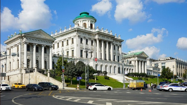 Мы с вами перешли через Большой каменный мост, и вот мы уже в главной части Москвы. Вот здание за мной (красивое, правда?). Это здание — один из символов города Москвы. Это дом Пашкова. Да, Пашков — это фамилия. Это был офицер русской армии, который в конце 18 века построил этот прекрасный дом. Уже в то время этот дом считался достопримечательностью города. Люди приходили сюда посмотреть на него. Если Вы любите русского писателя Булгакова, то вы найдёте в его романе место, когда герои его находятся на крыше этого дома и смотрят на Москву. Найдите это место и почитайте Булгакова. Роман называется «Мастер и Маргарита». И вообще с этим зданием связано очень много легенд. Говорят (и это большой секрет), что внизу, в земле, под этим зданием хранится одно из главных сокровищ русского царя Ивана Грозного — его библиотека. В 16 веке, когда жил Иван Грозный, книги были большой драгоценностью. У Ивана Грозного была огромная библиотека. Где она, никто не знает. Одна из легенд говорит, что находится внизу, под этим зданием.