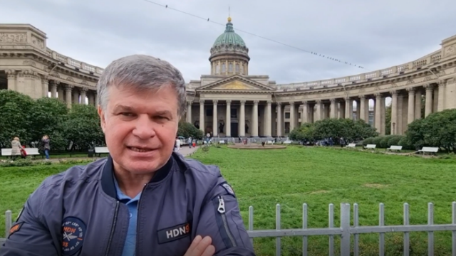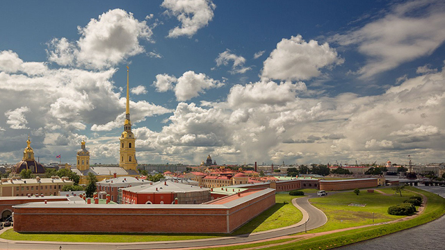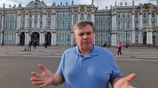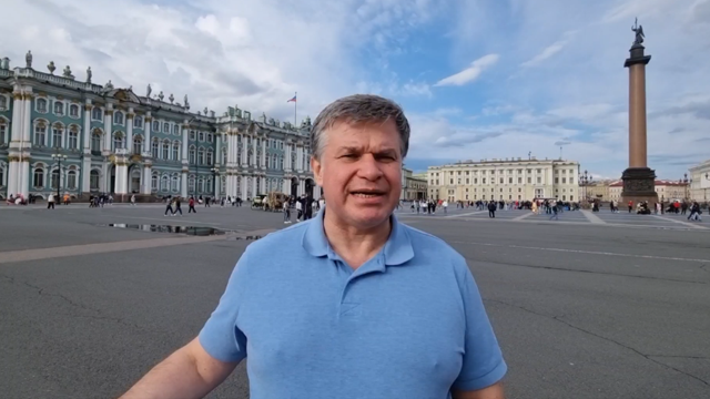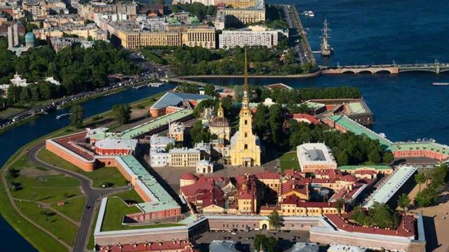 За мной находится один из самых главных символов Петербурга – Петропавловская крепость. Можно сказать, что это маленький Петербург, потому что дата, когда начали строить эту крепость - 27 мая 1703 года – считается днём рождения Петербурга. Итак, эту крепость построили, потому что в это время шла война со Швецией. И крепость имела очень важное военное значение. Но также люди говорят, что это первое место, откуда начался Петербург. Это крепость, которая находится на острове, который называется Заячий остров. Вообще, Петербург – это город на островах. Если Москва – это город на холмах, то Петербург – это город на островах. Говорят, что в Петербурге более 40 островов. Вот этот остров называется Заячий. А если мы посмотрим чуть-чуть подальше, где прекрасные колонны, этот остров называется Васильевский остров, или, как жители Петербурга ласково называют его, Васька. Там находится много очень интересных мест, и в том числе Санкт-Петербургский университет. После того как Петербург построили, Петропавловская крепость стала тюрьмой, политической тюрьмой. В этой тюрьме сидели те, кто был не согласен с политикой государства, кто был не согласен с руководителями государства. Эта тюрьма была очень крепкая: убежать оттуда не мог никто. Ну а сейчас, в наше время, там очень хороший, очень красивый музей, где можно прекрасно погулять. И в самом соборе Петропавловском, который вы видите, находятся могилы русских царей начиная с Петра Первого, который построил для себя эту столицу, потому что не очень любил Москву.