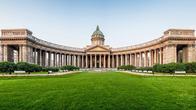 Пётр Первый начал строить Петербург в 1703 году. А уже в 1712 году город стал столицей России. Наверное, поэтому все храмы Петербурга такие большие, красивые и торжественные. Мы, конечно, не сможем рассказать вам обо всех храмах, но расскажем о главных из них. Посмотрите, пожалуйста, этот храм называется Казанский собор. Наверное, это самый главный храм города, потому что здесь находится старая икона Девы Марии. Жители города Петербурга верят, что, пока икона находится здесь, враг не войдёт в город. Казанский собор напоминает знаменитый храм Святого