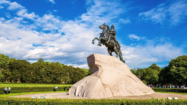 Это знаменитый Медный всадник – памятник Петру Первому, основателю Петербурга. Это символ города, его знак. Памятник появился в городе в 1782 году. Если мы посмотрим на памятник, мы увидим слова: «Петру Первому – Екатерина Вторая». Императрица Екатерина Вторая, или Великая, заказала этот памятник французскому архитектору Фальконе. И он появился здесь летом 1782 года. Пётр Первый смотрит на реку Неву и на здание Двенадцати коллегий, где сейчас находится Санкт-Петербургский университет. Почему же этот памятник называется Медный всадник? Дело в том, что именно так называется поэма великого русского поэта Александра Сергеевича Пушкина. «Медный всадник» - это интересная поэма, удивительная. В ней памятник Петру Первому становится живым. Не буду рассказывать поэму – прочитайте, пожалуйста.