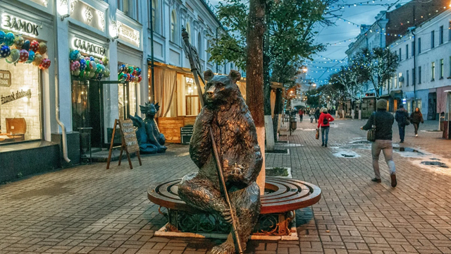 Символ Ярославля – медведь. По легенде, огромный медведь напал на князя Ярослава Мудрого, и был смертельный бой. Но здесь, на ярославском Арбате, мишка очень мирный и добрый, хотя и с топором. А вот видите, какой у него светлый нос, потому что все трут его на счастье.